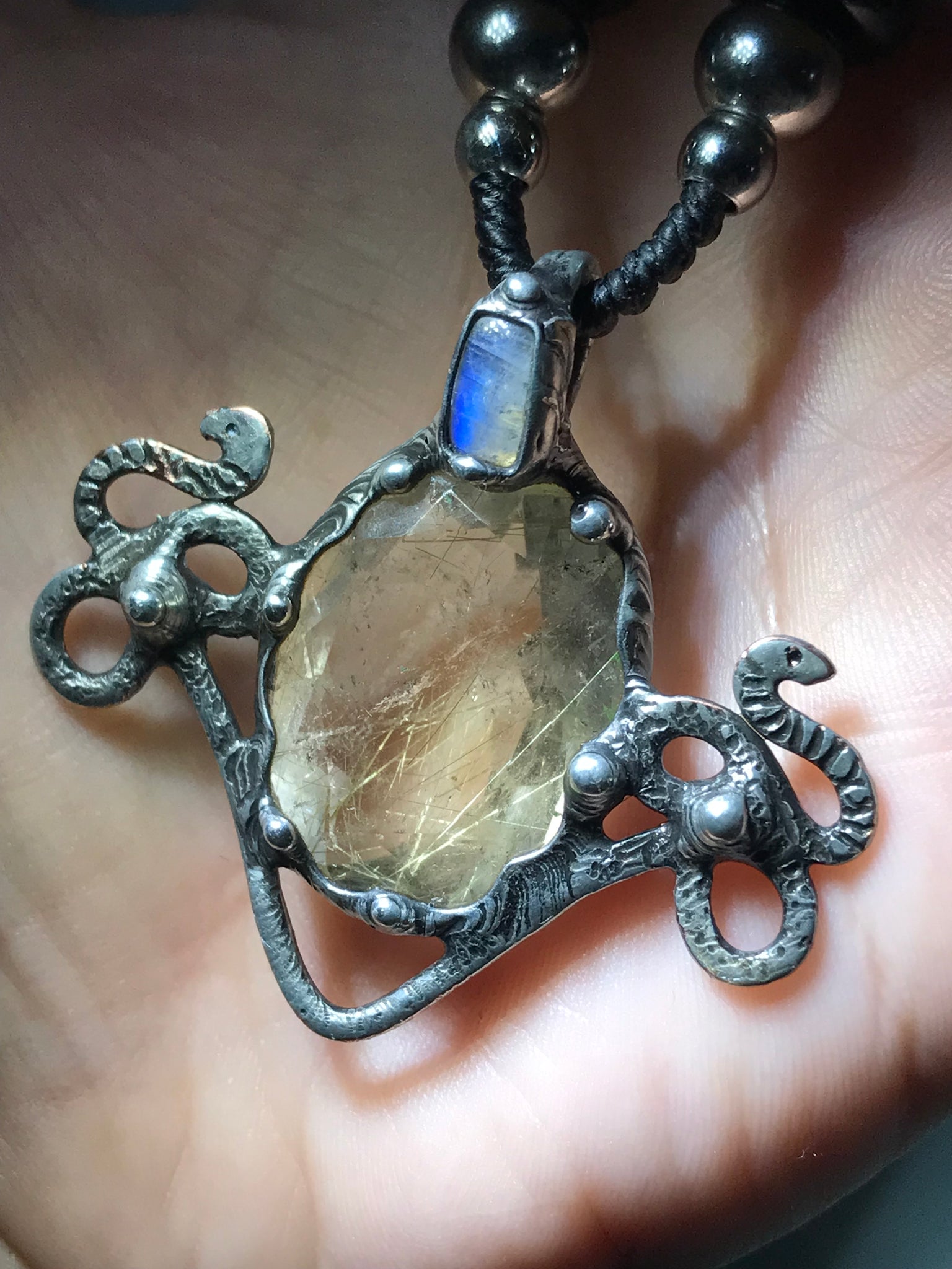 High priestess Golden Rutile and blue flash labradorite serpent pendant