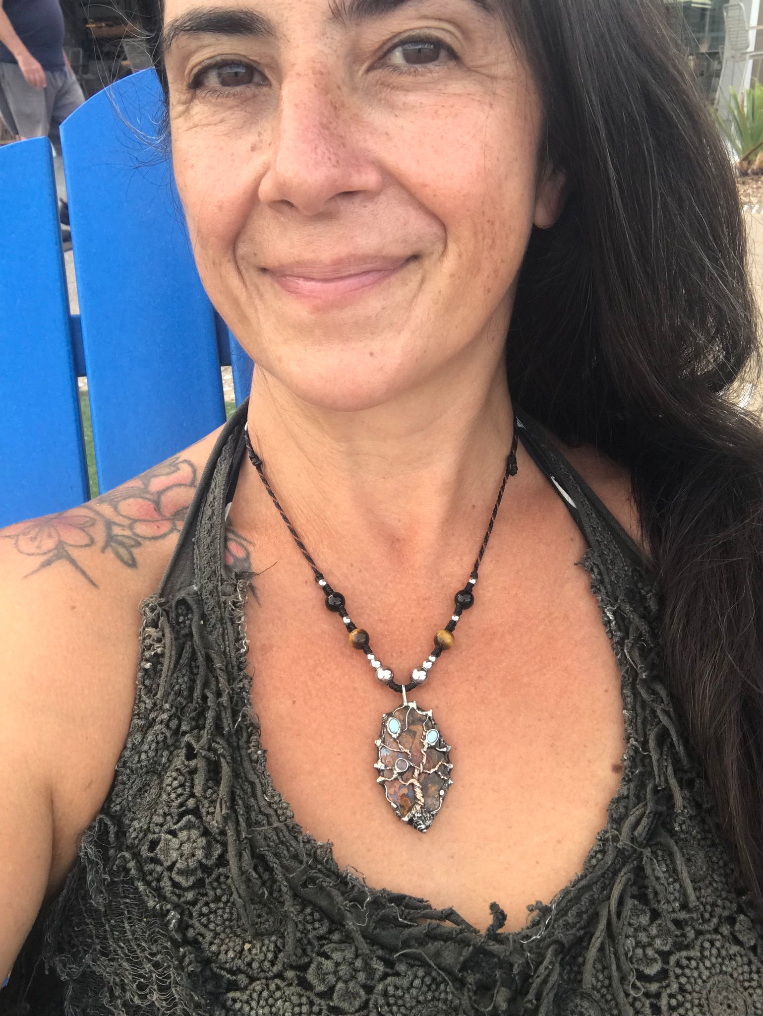 Twisted tree on brecciated jasper adorned with larimar and moonstone and tigereye beads